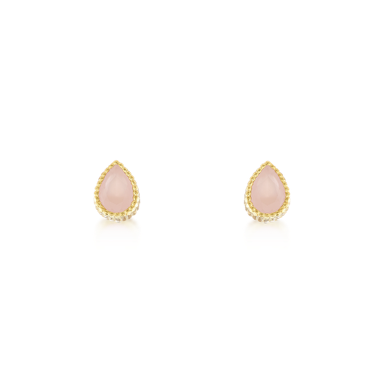 Brincos em prata dourada em forma de gota com zircónia rosa doce. Brincos pequenos com fecho de espeque. Calor a Cores é uma coleção de jóias de tons dourados e cores brilhantes.