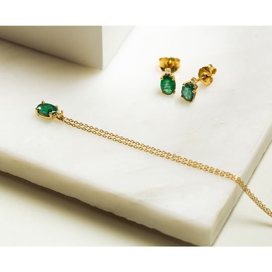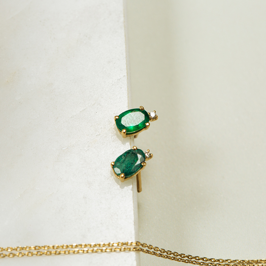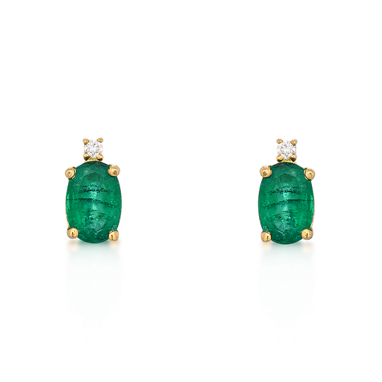 Brincos em ouro de 19,2 quilates com esmeralda oval e diamante no topo. Um design clássico e encantador, perfeito para quem procura um toque de cor com sofisticação.