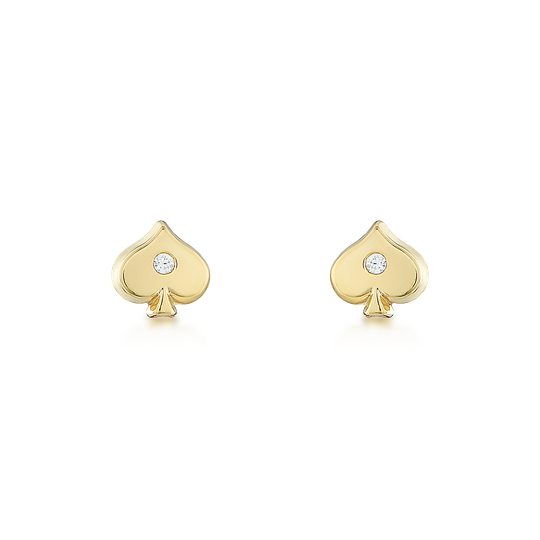 Brincos de criança em ouro de 9 quilates em forma do naipe espadas com zircónia no centro. Fecho de espeque.