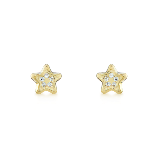 Brincos de criança em ouro de 9 quilates em forma de estrela com cinco zircónias redondas. Fecho de espeque.