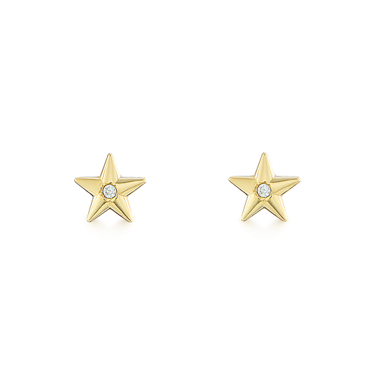 Brincos de criança em ouro de 9 quilates em forma de estrela com um zircónia redondas no centro. Fecho de espeque.
