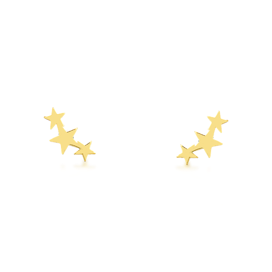Brincos em ouro de 9 quilates com três estrelas. Brincos pequenos com fecho de espeque.