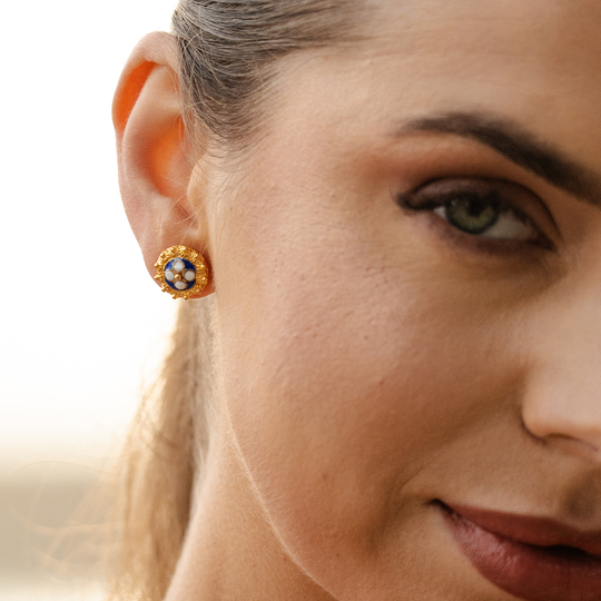 Brincos de filigrana em prata dourada redondos com fundo azul. Brincos com fecho de espeque.