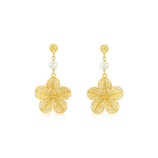 Brincos de filigrana em prata dourada. Brincos médios com pequena pérola e flor na extremidade. Fecho de espeque.