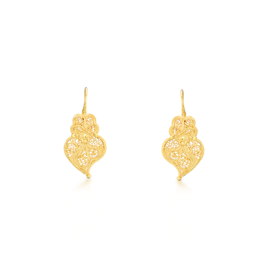 Brincos de filigrana em ouro de 19,2 quilates em forma de coração. Brincos com fecho de gancho. Uma jóia intemporal produzida artesanalmente em Portugal.