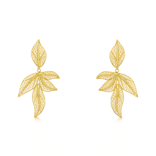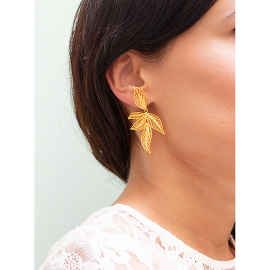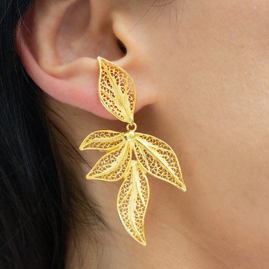 Brincos de filigrana em prata dourada. Um harmonioso jogo de pétalas nuns brincos longos com fecho de espeque.