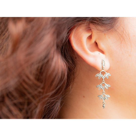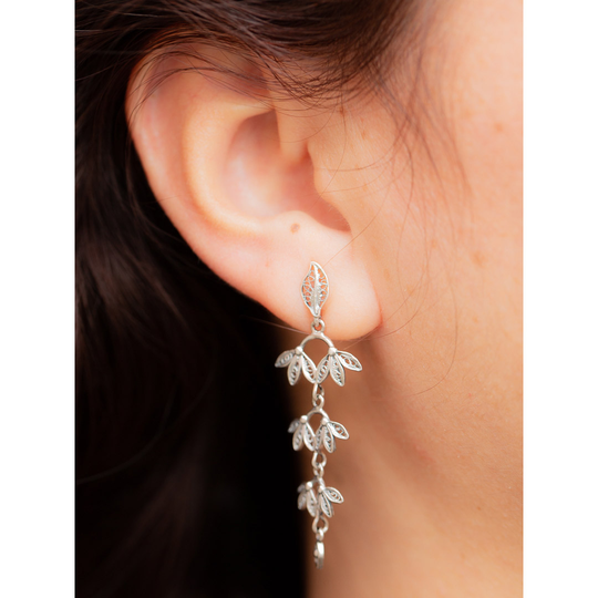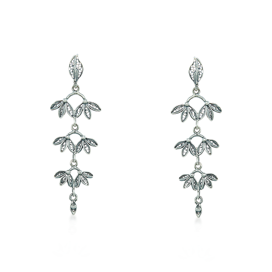 Brincos de filigrana em prata com fecho de espeque. Brincos compridos com delicadas pétalas pendentes.