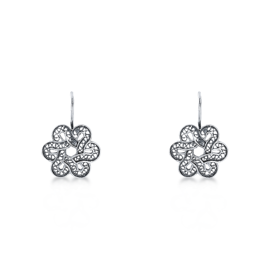 Brincos de prata em filigrana com fecho de gancho. Forma circular com efeito entrançado.