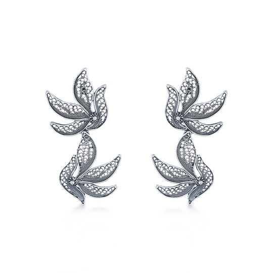 Brincos de filigrana em prata, com uma parte fixa e uma suspensa. Brincos longos com fecho de espeque.
