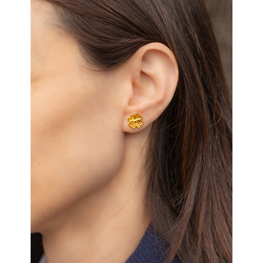 Brincos de filigrana em prata dourada em forma de trevo de quatro folhas. Brincos pequenos com fecho de espeque.