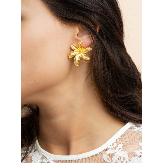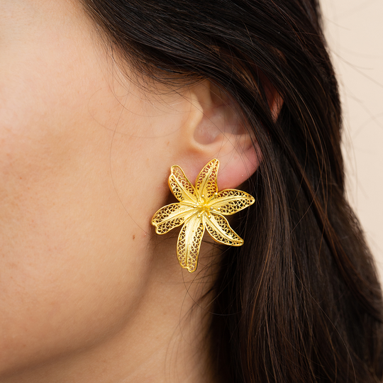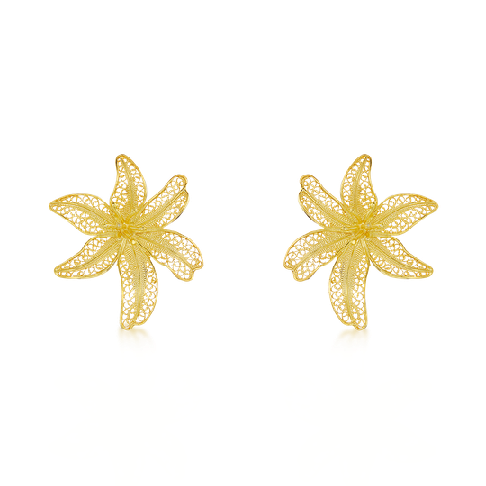 Brincos de filigrana em prata dourada em forma de flor coroa de rei. Brincos médios com fecho de espeque.