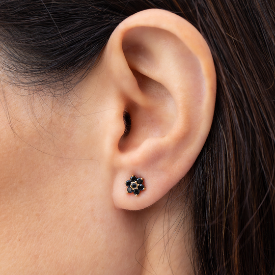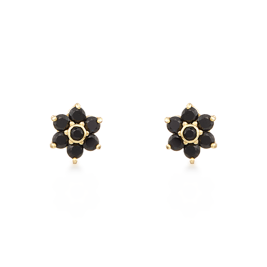 Brincos em ouro de 9 quilates com zircónias pretas formando uma flor redonda. Brincos com fecho de espeque.