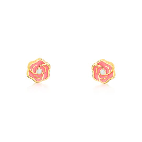 Brincos em ouro de 9 quilates em forma de flor rosa. Brincos pequenos com fecho de espeque.