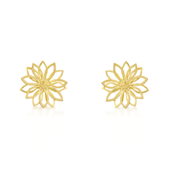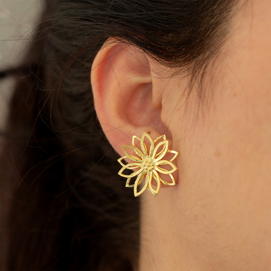 Leves e vistosos, estes brincos em prata dourada encantam com a sua forma de flor rendilhada. Uma peça com presença, ideal para destacar o teu estilo com graça.