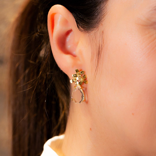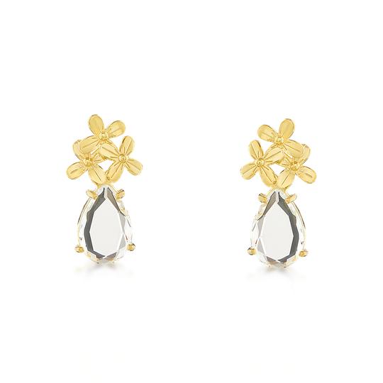 Brincos em prata dourada com três flores e uma gema incolor. Brincos com fecho de espeque.