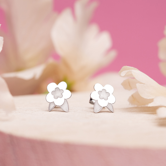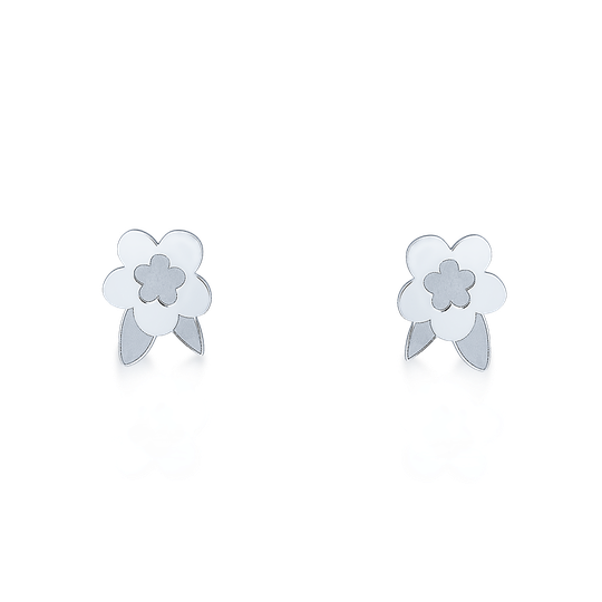 Brincos em prata em forma de flor com duas folhinhas. Apertam com espeque. Uma bonita surpresa para as mães.