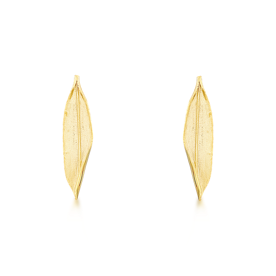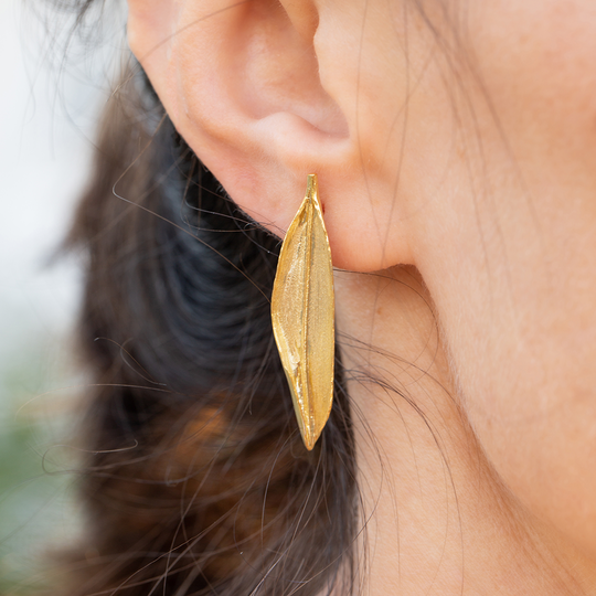 Brincos em prata dourada com folha longa. Brincos de espeque com acabamento acetinado.