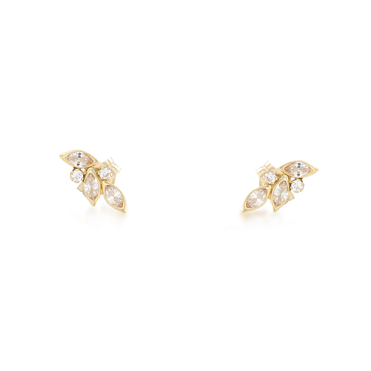 Brincos em ouro de 9 quilates e zircónias com dois círculos e três folhinhas. Brincos pequenos com fecho de espeque.
