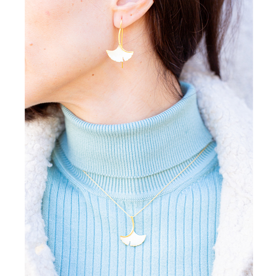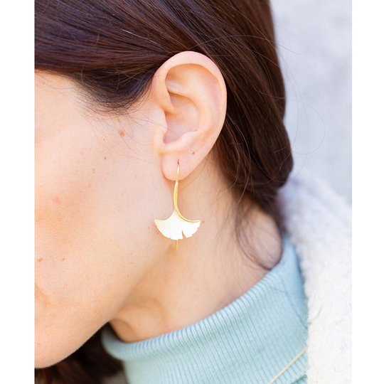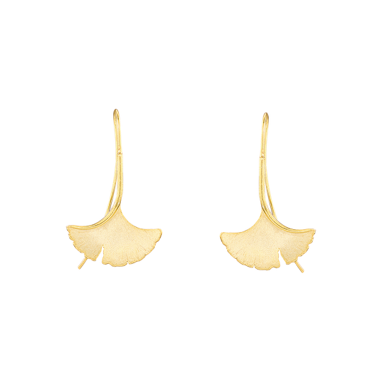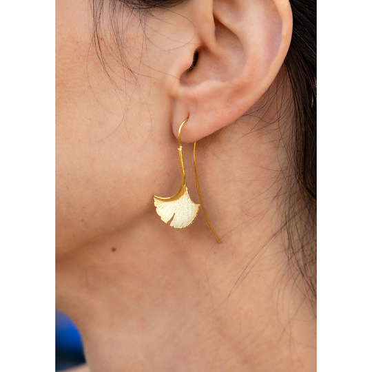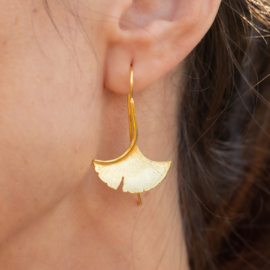 Brincos em prata dourada com folha de ginkgo biloba. Brincos de gancho com acabamento acetinado. A ginkgo biloba é um símbolo de longevidade, superação e paz.