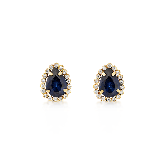 Brincos em ouro de 9 quilates em forma de gota com zircónia azul escuro e pequenas zircónias incolores à volta. Brincos pequenos com fecho de espeque.