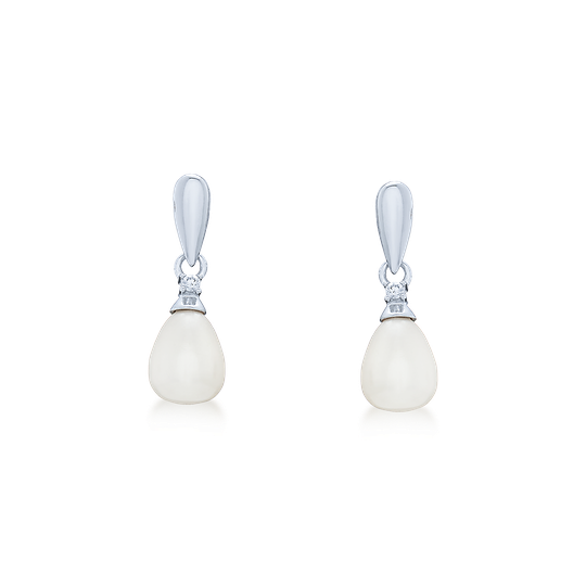 Brincos pendentes em prata com pequena zircónia e pérola de água doce. Brincos com fecho de espeque.