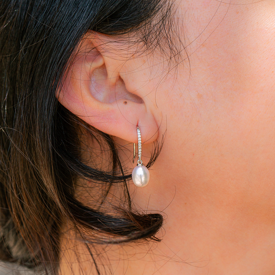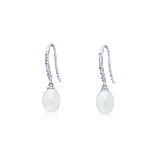 Brincos pendentes em prata com pequenas zircónias e pérola de água doce. Brincos de anzol, sem fecho.