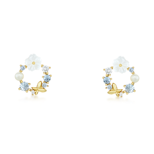 Brincos de espeque em prata dourada em forma de grinalda com zircónias azuis e incolor e flor branca. A coleção À Flor da Pele marca uma Primavera feliz.