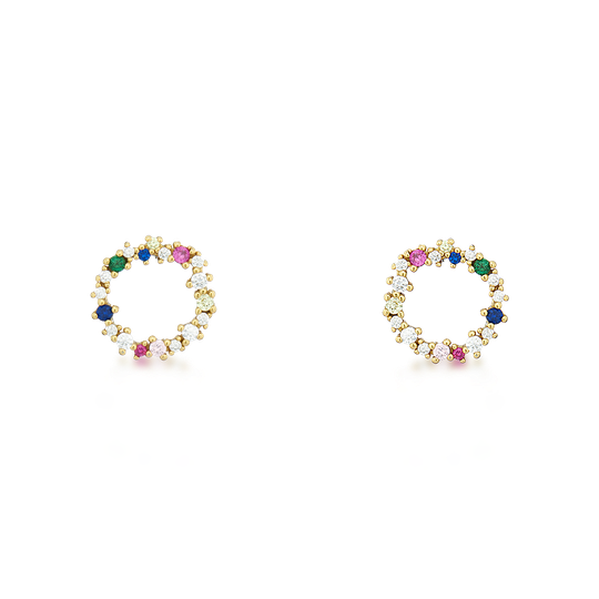 Brincos em prata dourada de forma circular com pequenas zircónias coloridas. Brincos com fecho de espeque.