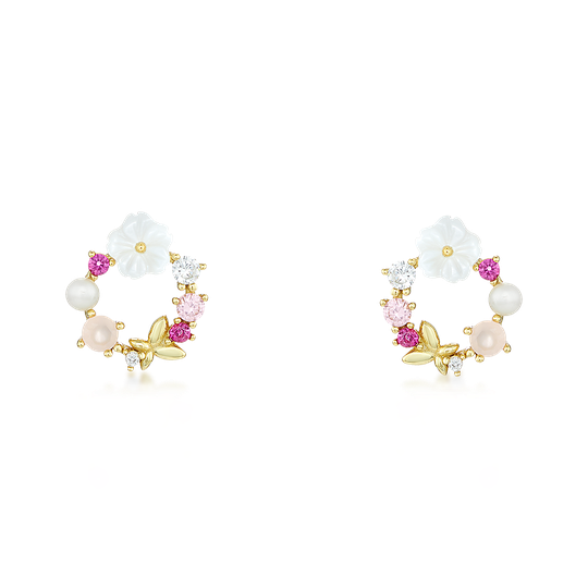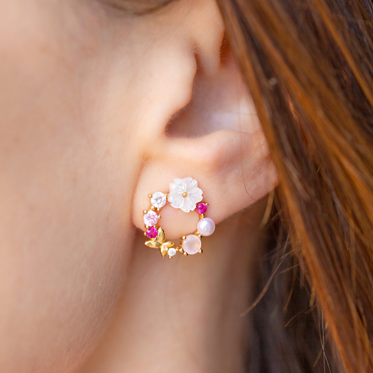 Brincos de espeque em prata dourada em forma de grinalda com zircónias rosas e incolor e flor branca. A coleção À Flor da Pele marca uma Primavera feliz.