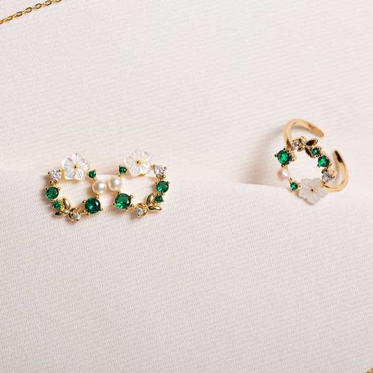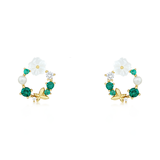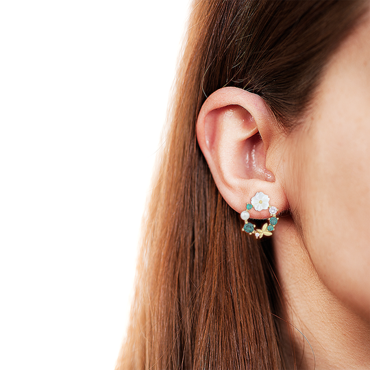Brincos de espeque em prata dourada em forma de grinalda com zircónias verdes e incolor e flor branca. A coleção À Flor da Pele marca uma Primavera feliz.