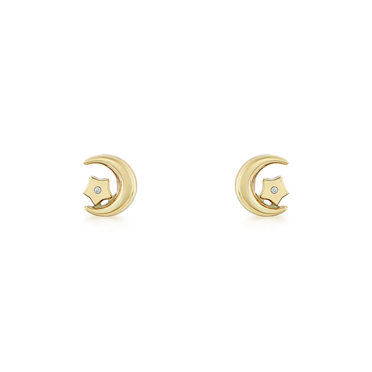 Brincos de criança em ouro de 9 quilates. Forma de lua crescente com estrelinha e pequena zircónia. Fecho de espeque.