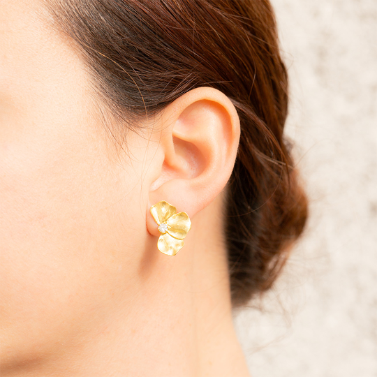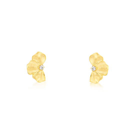 Brincos em prata dourada em forma de meia flor com zircónia. Brincos com fecho de espeque.