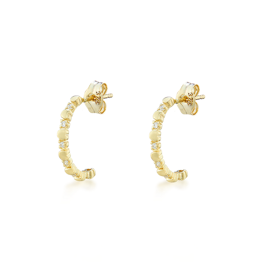Meias argolas cravadas com zircónias. Brincos em ouro de 9 quilates com fecho de espeque.