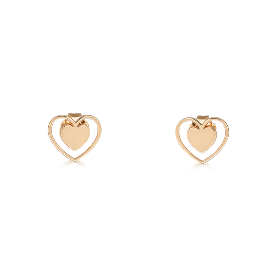 Brincos em ouro amarelo 19,2Kt em forma de coração com coração mais pequeno no interior. Apertam com espeque. Um jogo visual leve que remete para sentimentos de pertença.