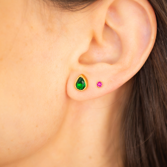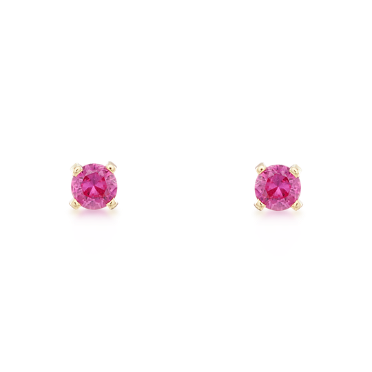 Brincos em ouro de 9 quilates redondos com zircónia rosa fúcsia. Brincos pequenos com fecho de espeque. Calor a Cores é uma coleção de jóias de tons dourados e cores brilhantes.