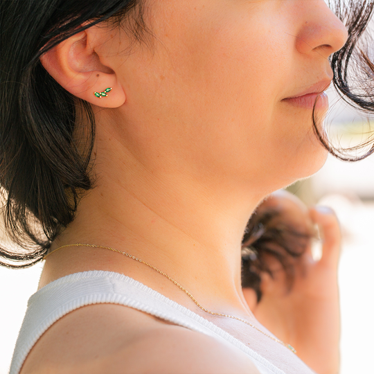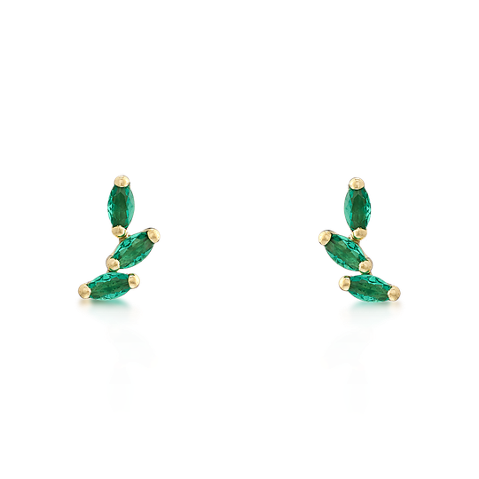 Brincos em ouro de 9 quilates que se destacam pelo design leve, com zircónias verdes em forma oval, criando um efeito orgânico e elegante junto à orelha.