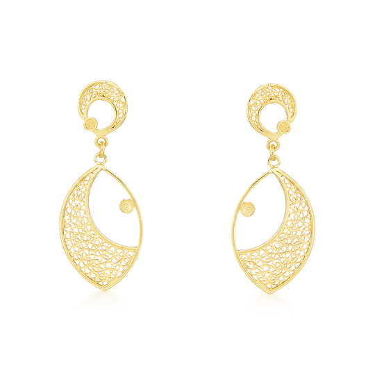 Brincos de filigrana em prata dourada, com forma oval. Brincos médios com fecho de espeque.