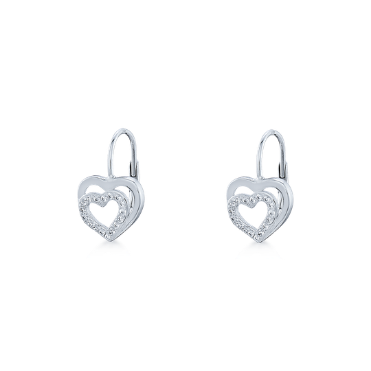 Brincos em prata com coração e outro coração com zircónias no interior. Brincos com fecho de gancho, confortáveis e fáceis de colocar.