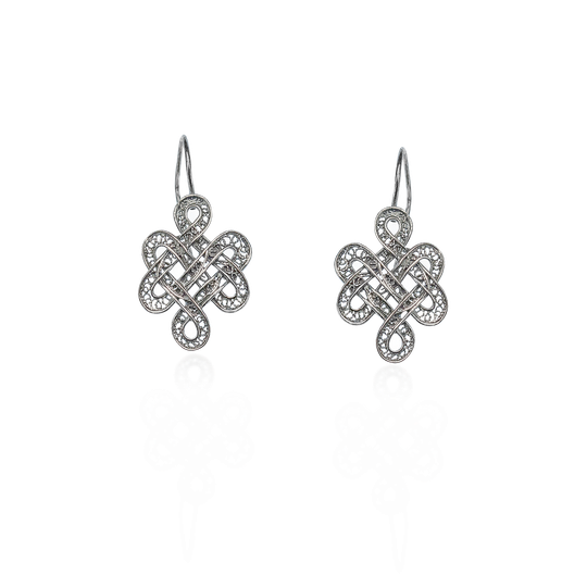 Brincos de filigrana em prata. Brincos médios com motivo entrelaçado. Fecho de gancho.