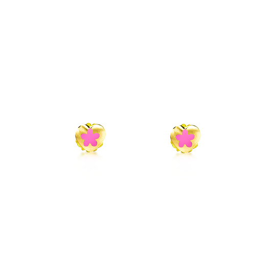 Brincos em ouro de 9 quilates em forma de coração com pequena flor rosa no centro. Brincos pequenos que apertam com fecho de espeque.