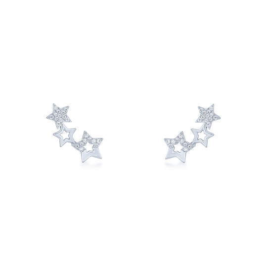 Brincos em prata com três estrelas com zircónias. Brincos trepadores, com fecho de espeque.