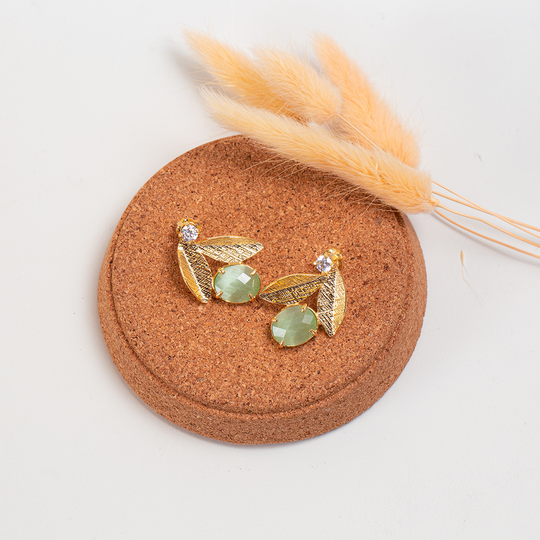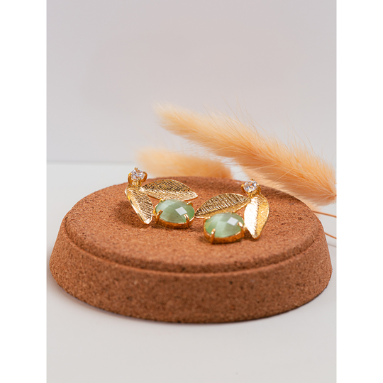 Brincos em prata dourada com duas folhas, uma gema verde e uma pequena gema incolor. Fio ajustável.