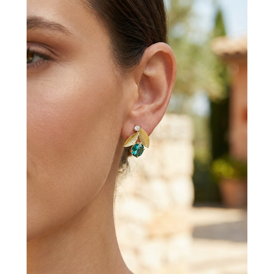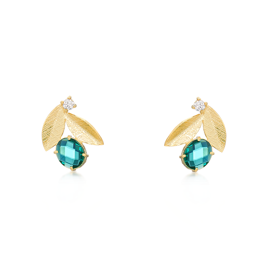 Brincos em prata dourada com duas folhas, uma gema verde e uma pequena gema incolor. Fio ajustável.