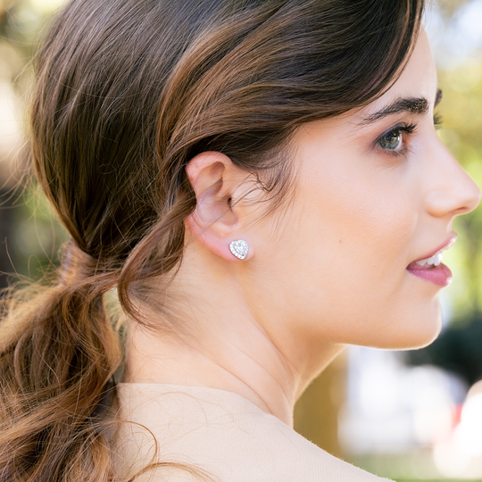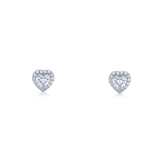 Brincos em prata 925 com zircónia incolor em forma de coração e pequenas zircónias em redor. Pequenos brincos com fecho de espeque.