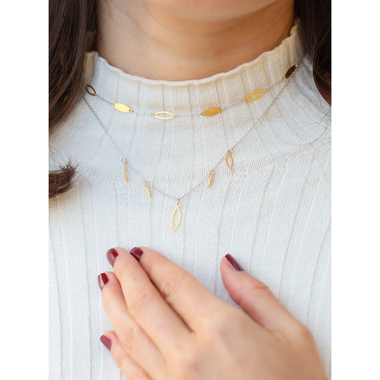 Colar curto com fio em prata e cinco pendentes horizontais em prata dourada com acabamento polido. Choker Energia da colecção Nativa da Dlight. A Dlight é uma marca de design original do Lugar da Jóia com uma embalagem sustentável que contém sementes de camomila para plantar.