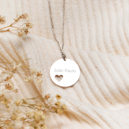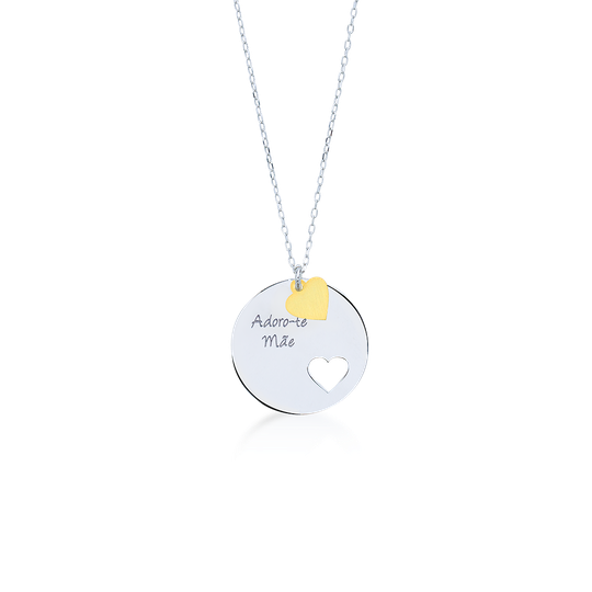 Colar em prata com medalha redonda e pequeno coração recortado, e pequeno coração dourado. Com fio ajustável. Pendente com a mensagem "Adoro-te Mãe" que pode ser personalizado com uma gravação no verso, como a assinatura, por exemplo.