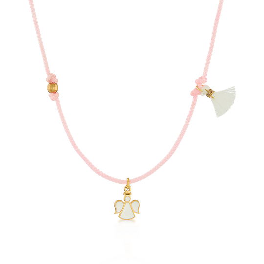 Colar com pendente em prata dourada em forma de anjinho. Com fio de algodão rosa ajustável e um pequeno lacinho branco, é um colar delicado e cheio de ternura — perfeito para crianças ou para oferecer como um miminho especial. Colar com fecho.