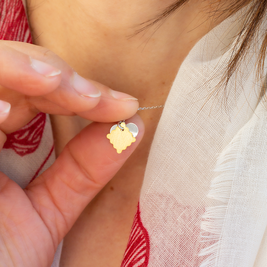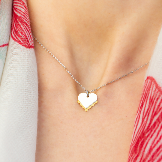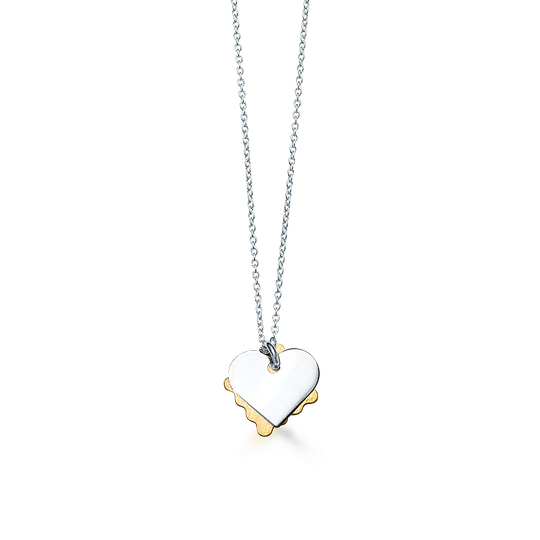 Colar em prata com dois pendentes: um coração em prata polida e uma cartinha em prata dourada com acabamento escovado. Na cartinha pode ser gravada uma mensagem secreta que fica escondida atrás do coração (até 5 caracteres). Uma criação do Lugar da Jóia para celebrar o amor.
