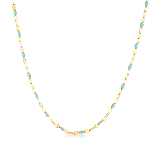 Delicado e luminoso, este colar em prata dourada destaca-se pelas pequenas pedras em azul claro distribuídas ao longo da corrente. Uma peça elegante e versátil, perfeita para dar um toque de cor suave ao teu look diário.