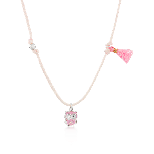 Colar com pendente em prata em forma de coruja. Com fio de algodão rosa-claro ajustável e um pequeno lacinho rosa, é um colar delicado e cheio de ternura — perfeito para crianças ou para oferecer como um miminho especial. Colar com fecho.